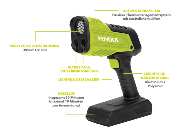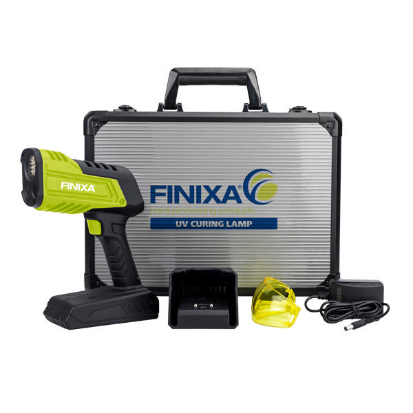 Die Finixa UV-Härtungslampe ist eine wiederaufladbare UV-Härtungslampe, die die neueste Ultra-Hi-Flux-UV-A-LED-Technologie nutzt, um alle gängigen UV-härtbaren Produkte für den Automobil- und Industriebereich auszuhärten: Spachtelmassen, Grundierungen, Klarlacke, Harze und Klebstoffe.