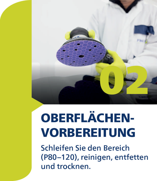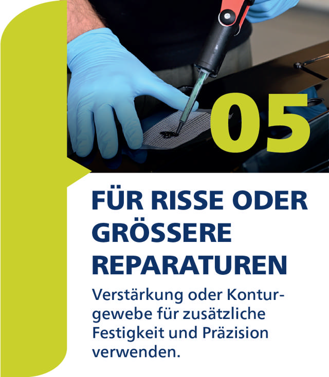 Dieses professionelle Set enthält eine Auftragspistole, Mischspitzen, Kontur- und Verstärkungsgewebe, drei Reparaturharze mit unterschiedlicher Aushärtungsgeschwindigkeit (schnell, mittel, langsam), einen Haftvermittler und Foam It!