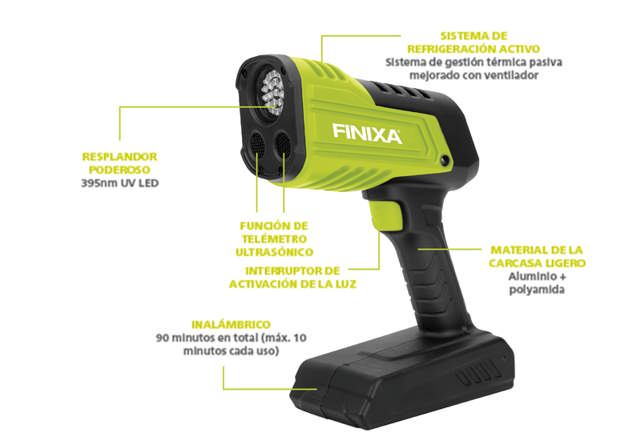 La lámpara de curado UV Finixa es una lámpara de curado UV recargable con la última tecnología LED UV-A de muy alta potencia para los productos industriales y de automoción curables más comunes: masillas, aparejos, barnices, resinas y adhesivos.