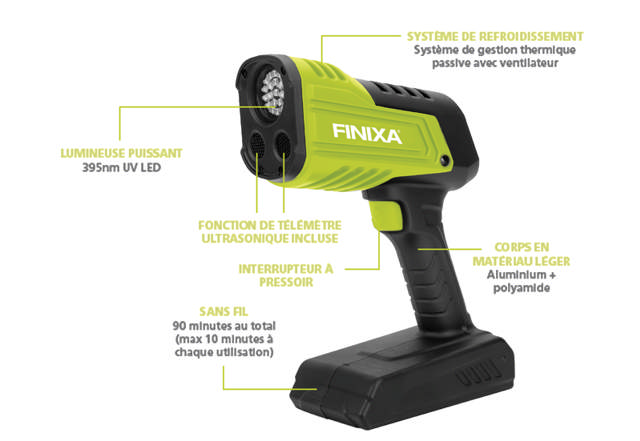 La lampe de séchage Finixa UV est une lampe de séchage UV rechargeable qui utilise la dernière technologie LED UV-A ultra-hi-flux pour sécher tous les produits automobiles et industriels courants qui permettent un séchage UV : mastics, apprêts, vernis, résines et adhésifs.