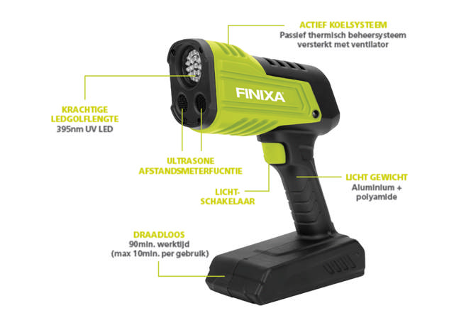 De UV-drooglamp van Finixa is een oplaadbare UV-drooglamp die gebruikmaakt van de allernieuwste ultra-hi-flux UV-A LED-technologie om alle gangbare auto- en industriële met ultraviolet uithardbare producten uit te harden: plamuren, primers, blanke lakken, harsen en lijmen.